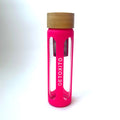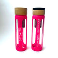 Vysoce odolné borosilikátové sklo s protiskluzovým pogumováním, sítkem z nerezové oceli a bambusovým víčkem s minimalistickým logem. Láhev, která vám padne ke všem outfitům.